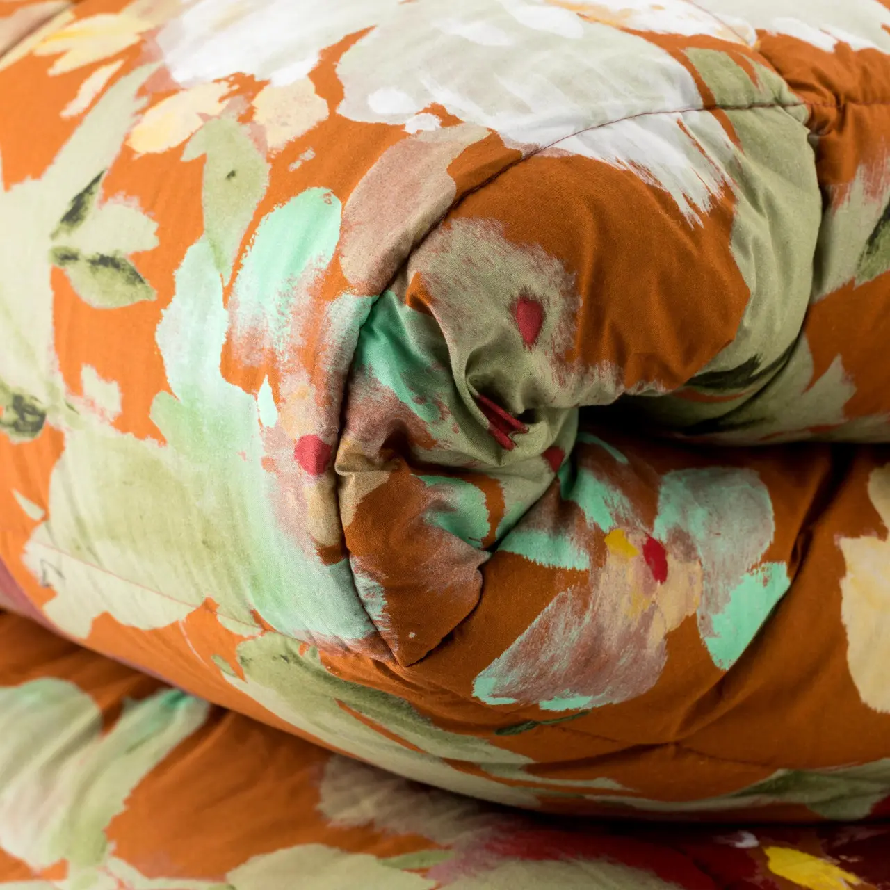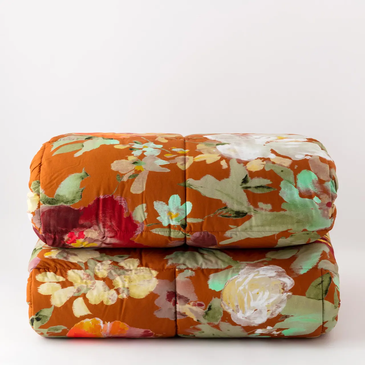 Fronte in velluto stampato e retro in 100% cotone, la trapunta ha un’imbottitura di 350gr 100% poliestere.